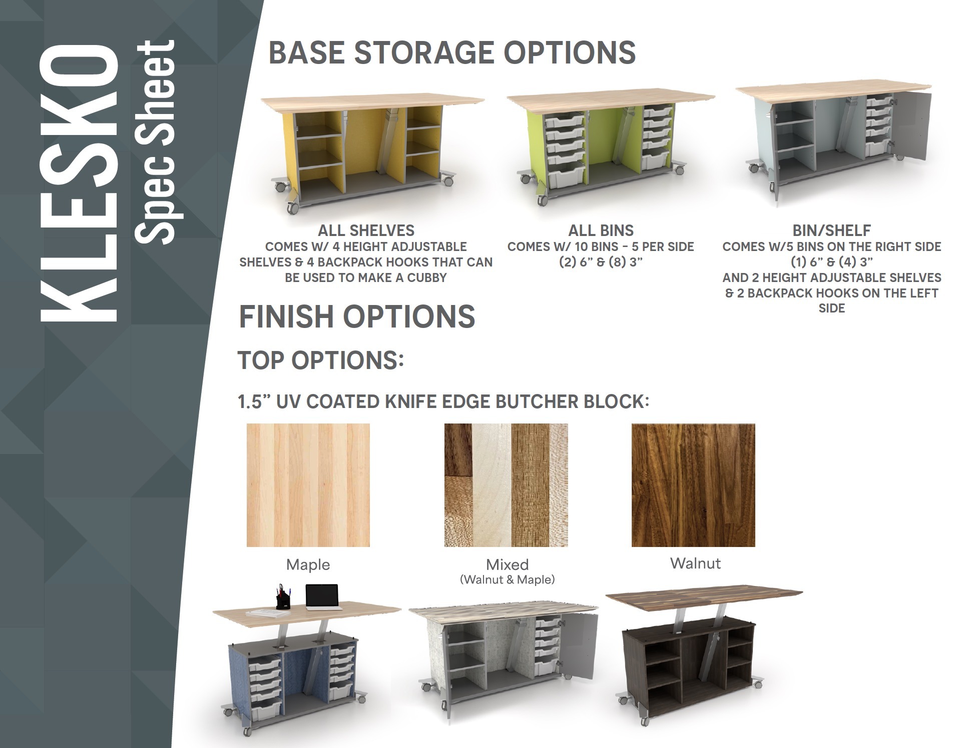 Customization is key with the Klesko Desk. Each cabinet to the left or right of the center can be customized with storage trays, height-adjustable shelves, or open storage with hooks to keep your personal belongings organized and accessible. For added security, optional locking doors are available for peace of mind.
