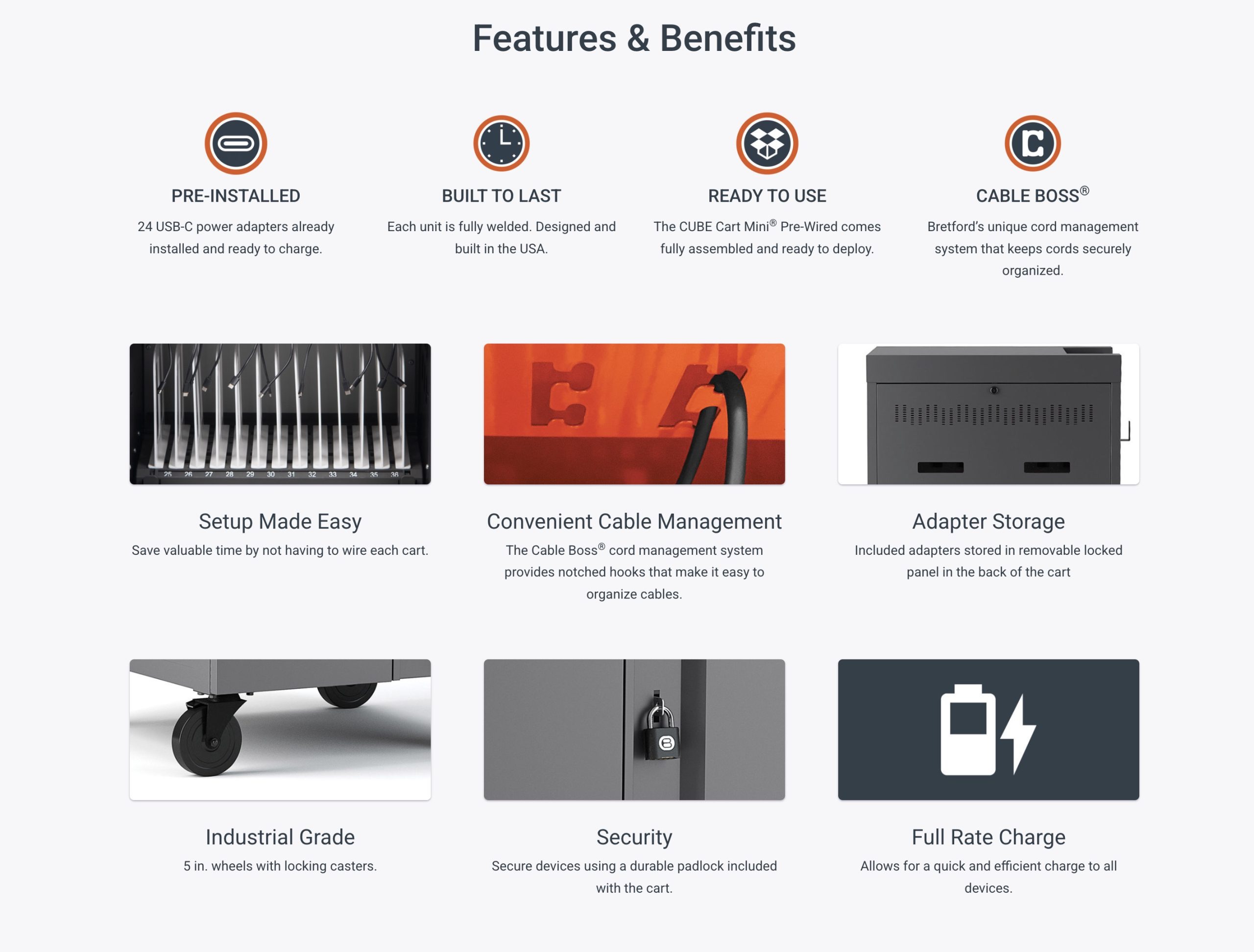 Cable Boss – This cart features a unique cord management system that enables a quick and convenient wiring method while keeping cords securely organized.