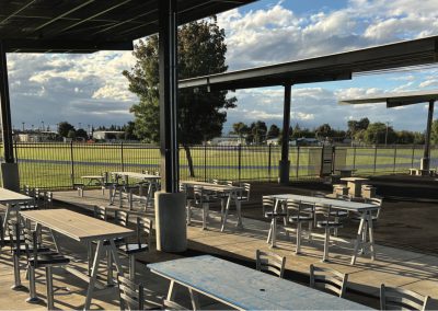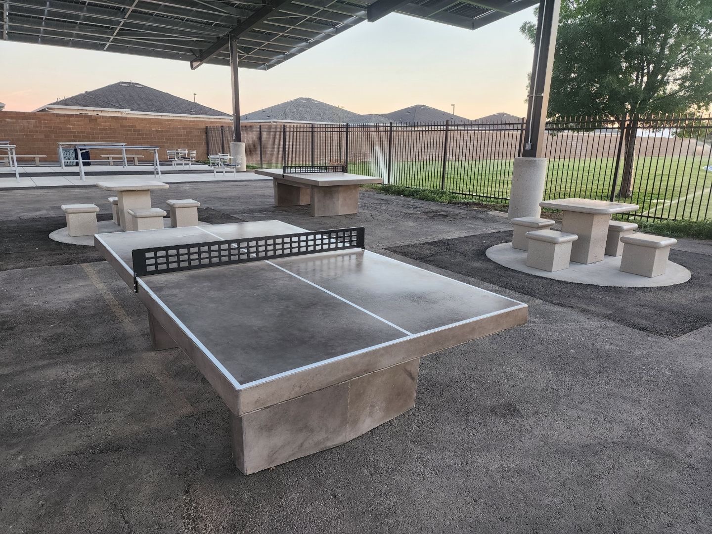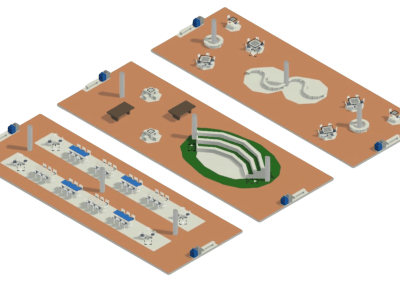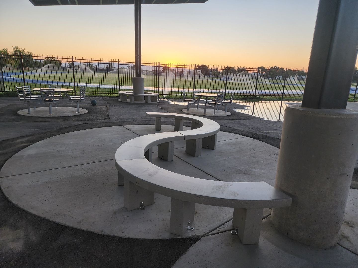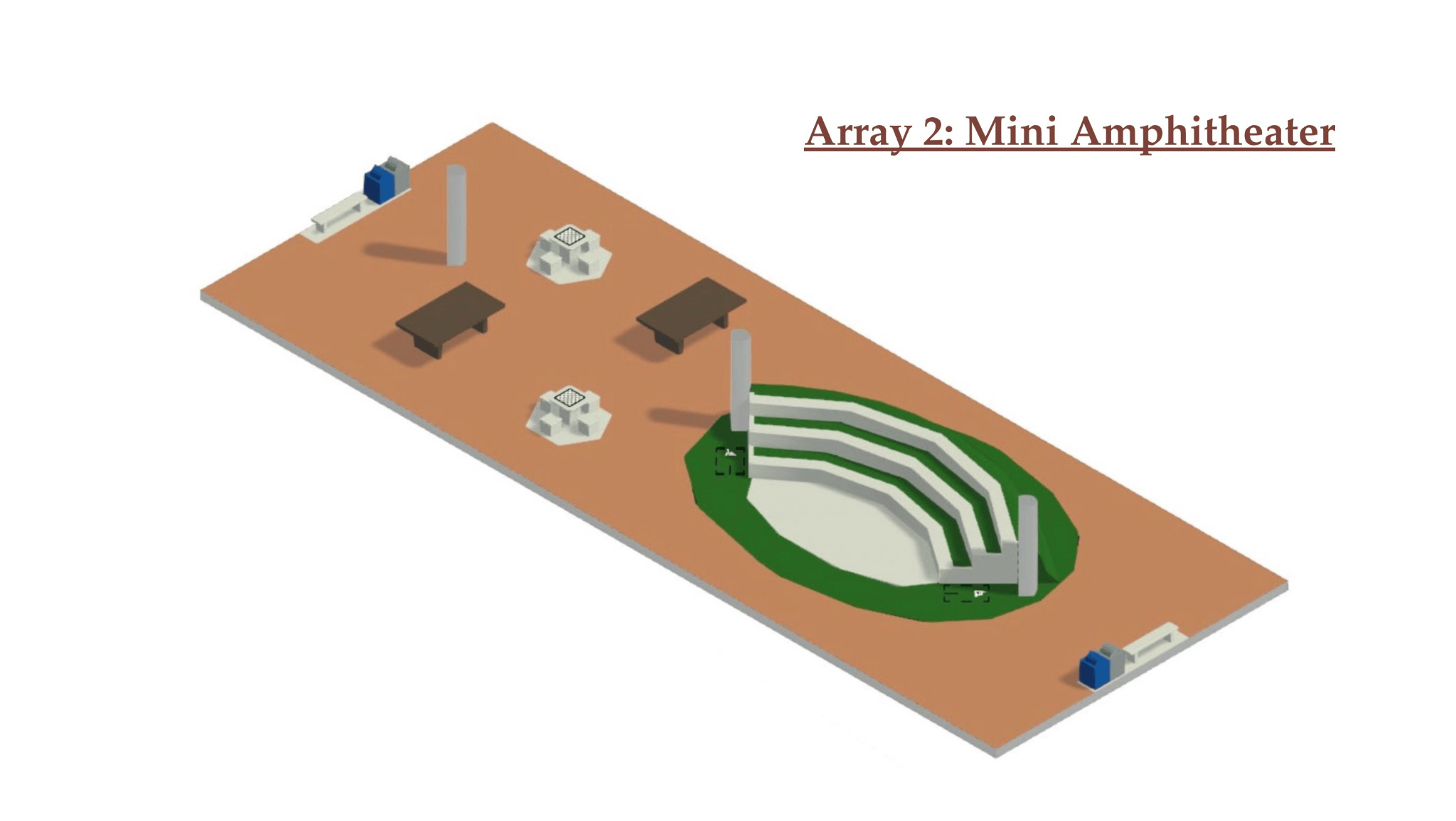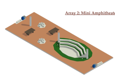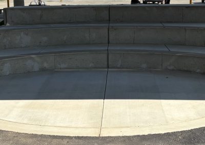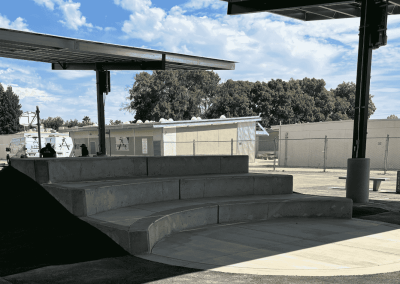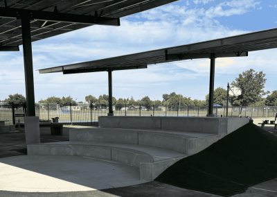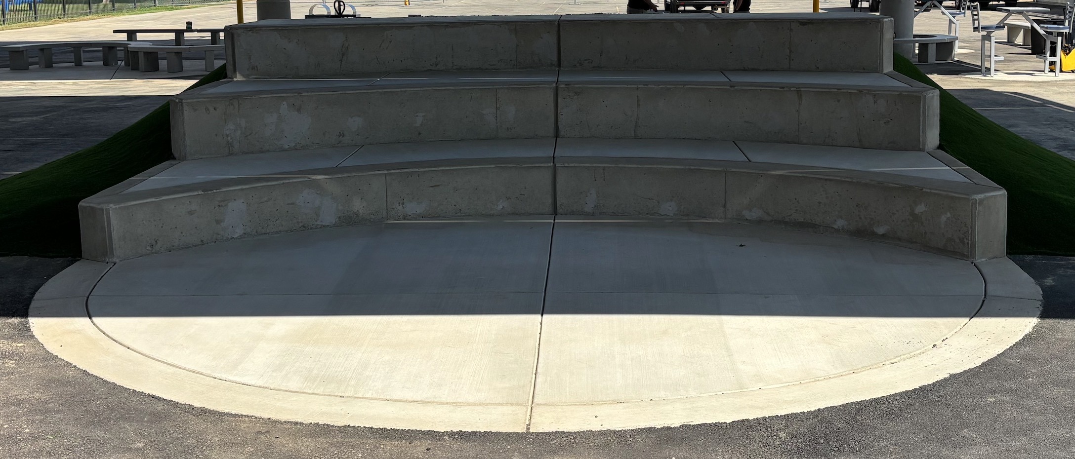Central to the design was a half-circle three-tiered above ground cement amphitheater with access to electricity from the solar panels. The backside of the amphitheater has a sloping artificial turf knoll.