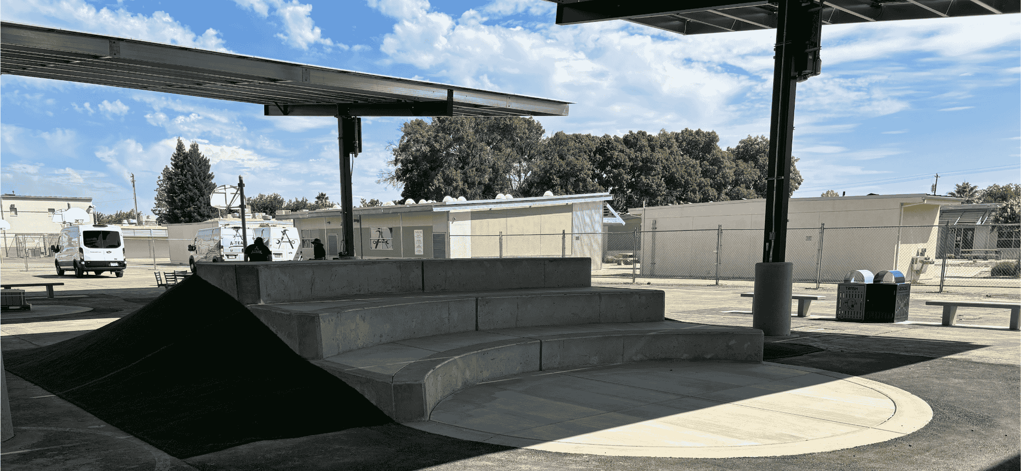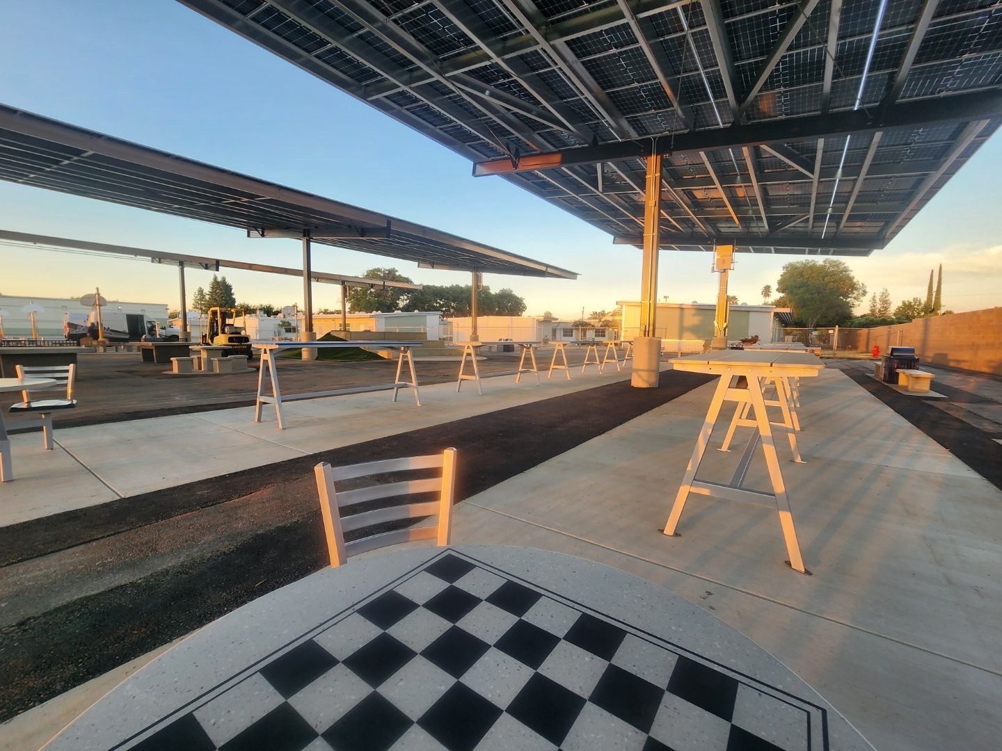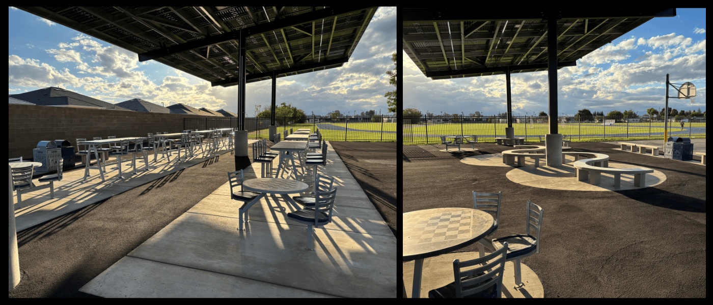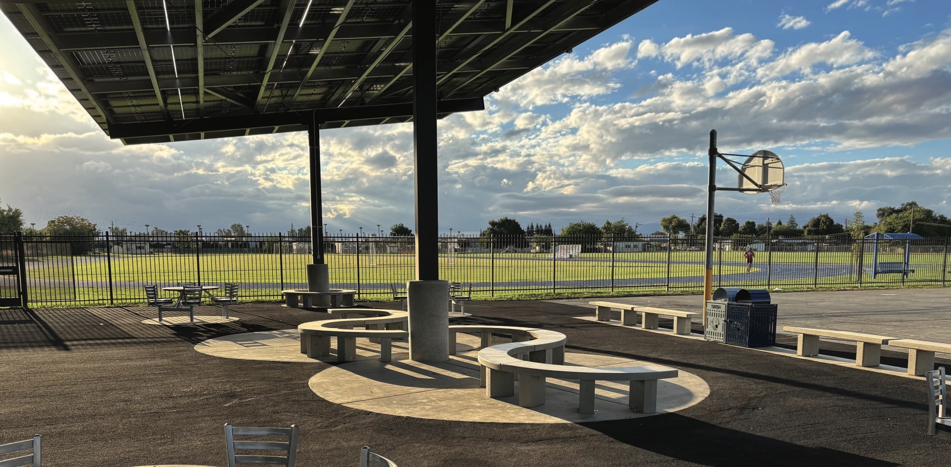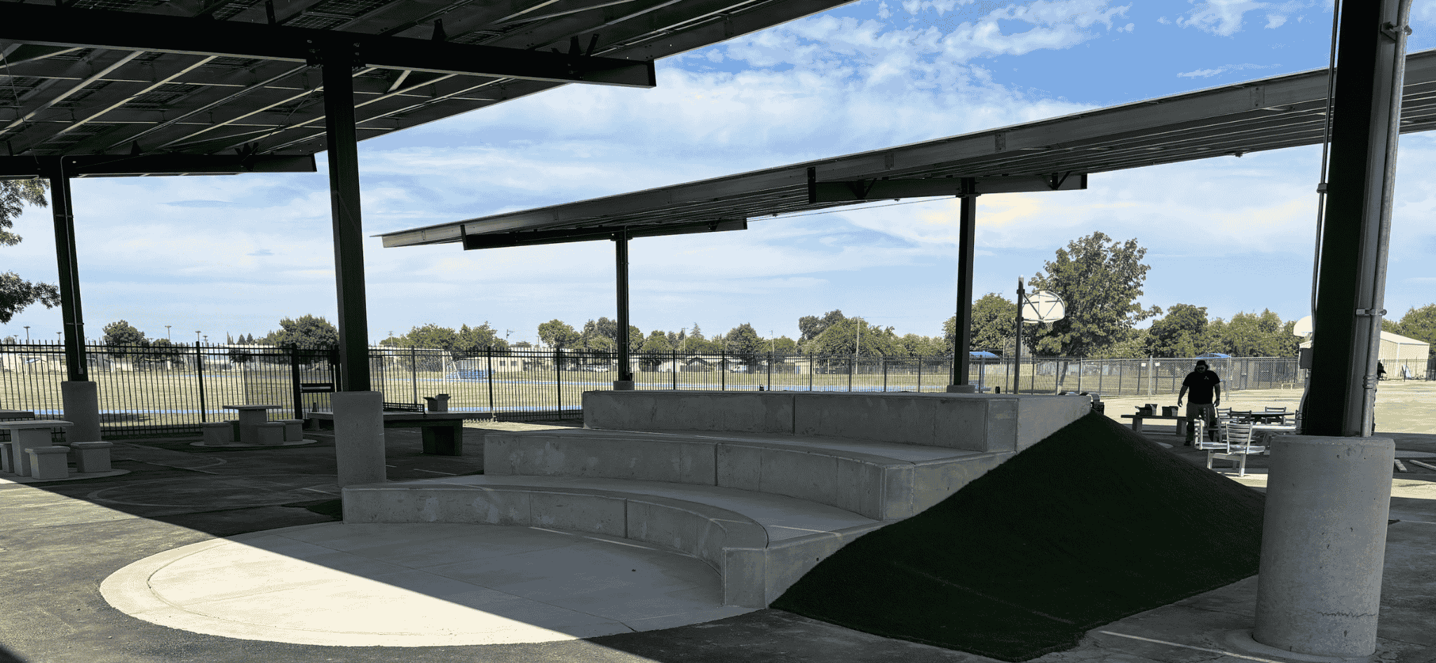 At Maywood DaVinci Middle School, three solar array panels had been built and installed in what had been outdoor basketball courts with an asphalt surface.