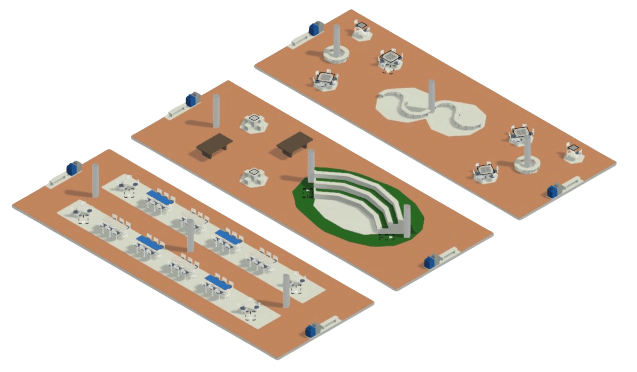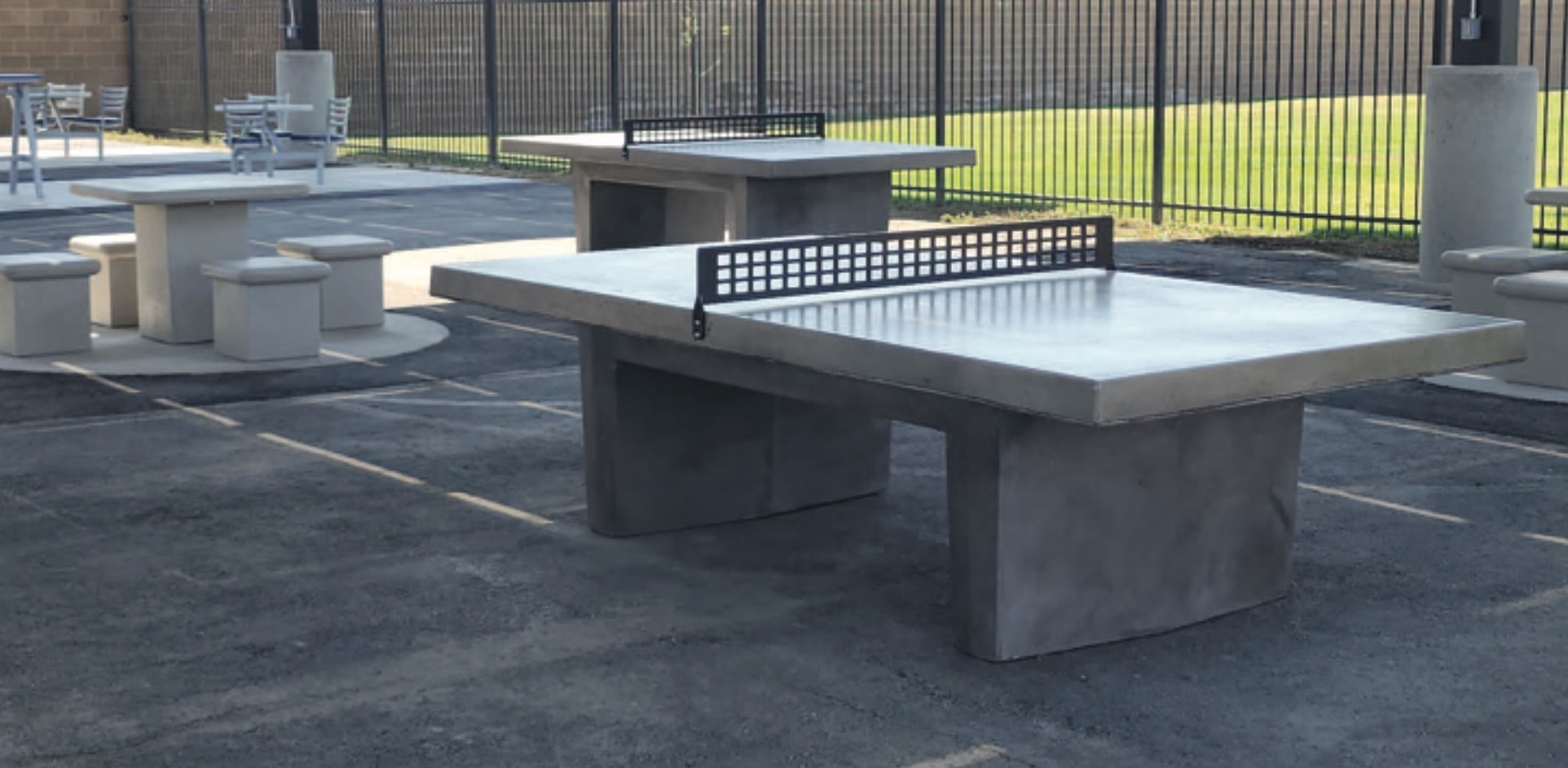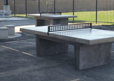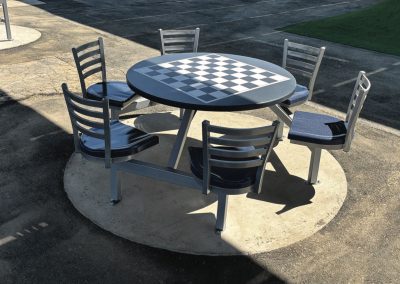 This unique learning environment was purposely designed with a variety of small to large group configurations for students to gather informally as well. There are two concrete table tennis tables and all of the circle and square tables have an embossed chessboard square as the school has an active chess playing community of students.