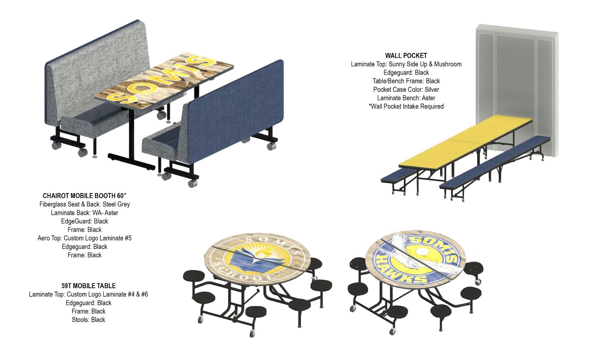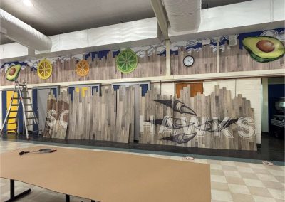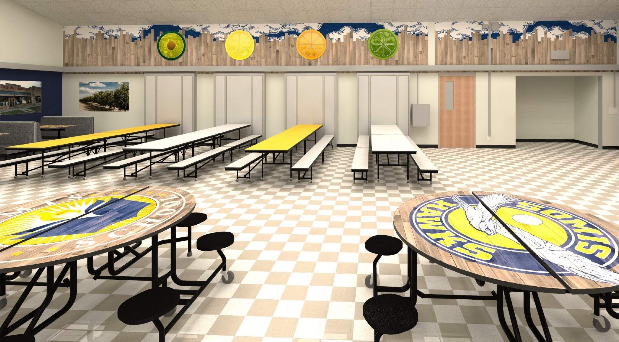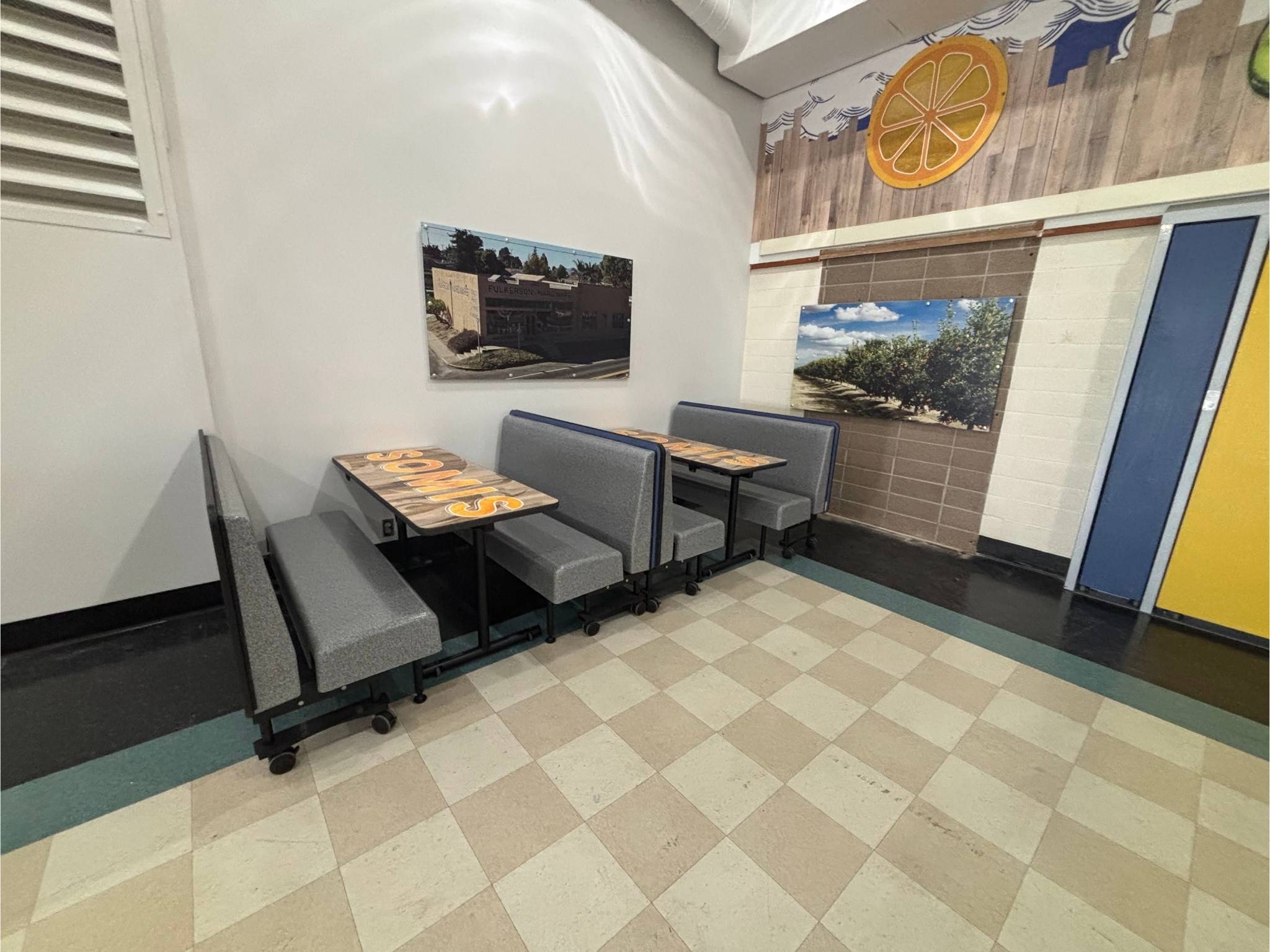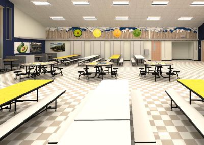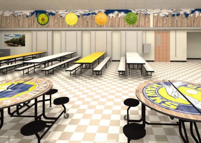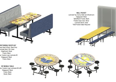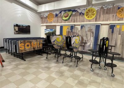 To achieve this vision, D&D Learning Spaces interviewed key stakeholders of the school and presented numerous options for cafeteria furniture and décor. Ultimately, the school embraced an agricultural theme of the community, by displaying local crops, produce, and historic photos for the wall graphic art. The Palmer Hamilton furniture selected combined traditional pocket cafeteria tables, with flexible “school themed” furniture, to create a space that attracts students to hang out in and spend time outside of the traditional lunch hour.