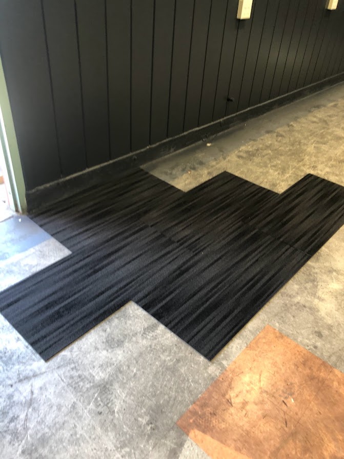 (*Ceiling installed Wave Baffles and cylinder drop down lights at Centennial HS.) - Commerical Carpet Tiles 18″ x 36″
